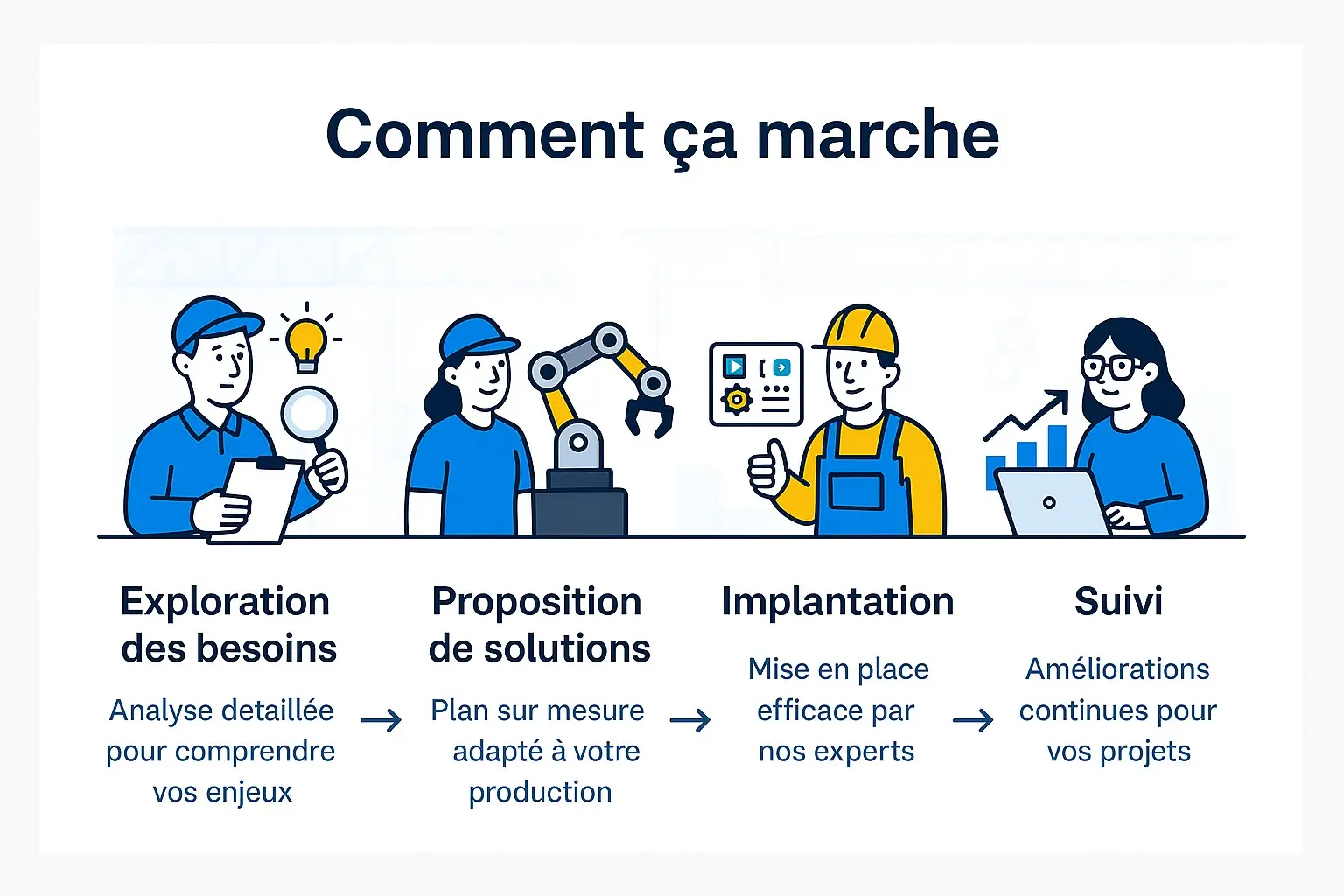 Planifiez une consultation Google Meet de 30 mins avec un expert neutre pour explorer vos enjeux de production. Si une Visite SMART est de mise, nous irons vous visiter afin de cartographier votre réalité planché ainsi que les solutions d’automatisation pour résoudre vos enjeux de productivités.